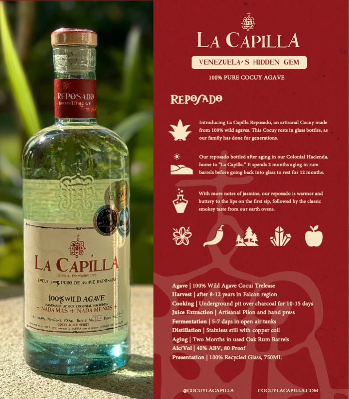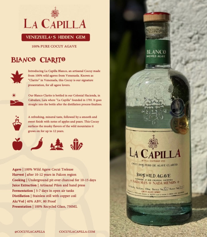 Our Blanco Clarito is bottled in our Colonial Hacienda, in Cabudare, Lara where ”La Capilla” was founded in 1793. It goes straight into the bottle after the distillation process finalizes. "Clarito," as its traditionally referred to in Venezuela, is a Cocuy that does not go through any aging.